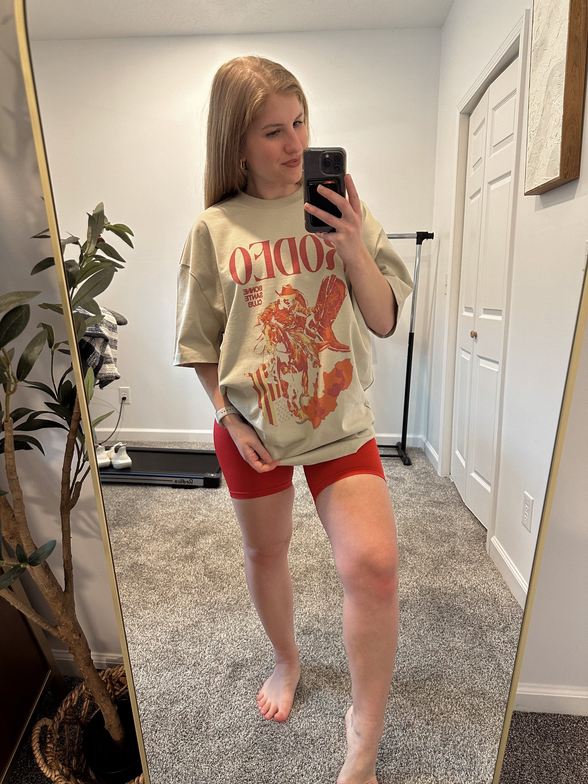 Model is wearing a L. This product runs one whole size large. We recommend sizing down for a closer fit and up for a baggier fit.